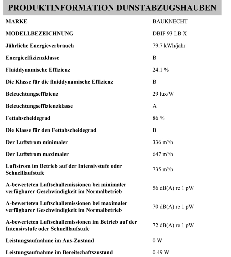 - Gebläseleistung im Abluftbetrieb: max. Normalstufe 647 m³/h, Intensivstufe 735 m³/h