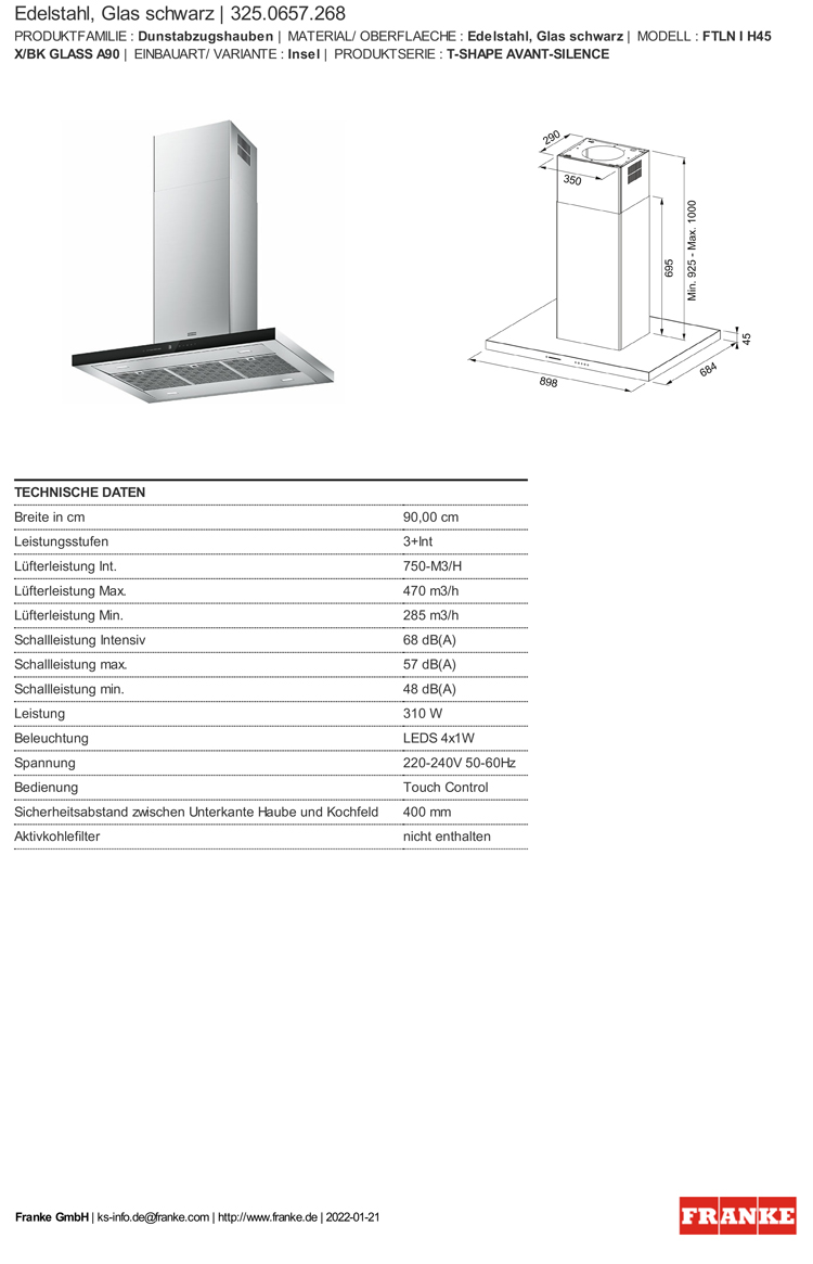 - Sicherheitsabstand zwischen Unterkante Haube und Induktions-Kochfeld: 50 cm, Gaskochfeld : 65 cm