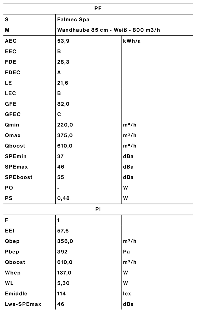 Ausstattungsmerkmale Wandhaube Falmec Flipper:
