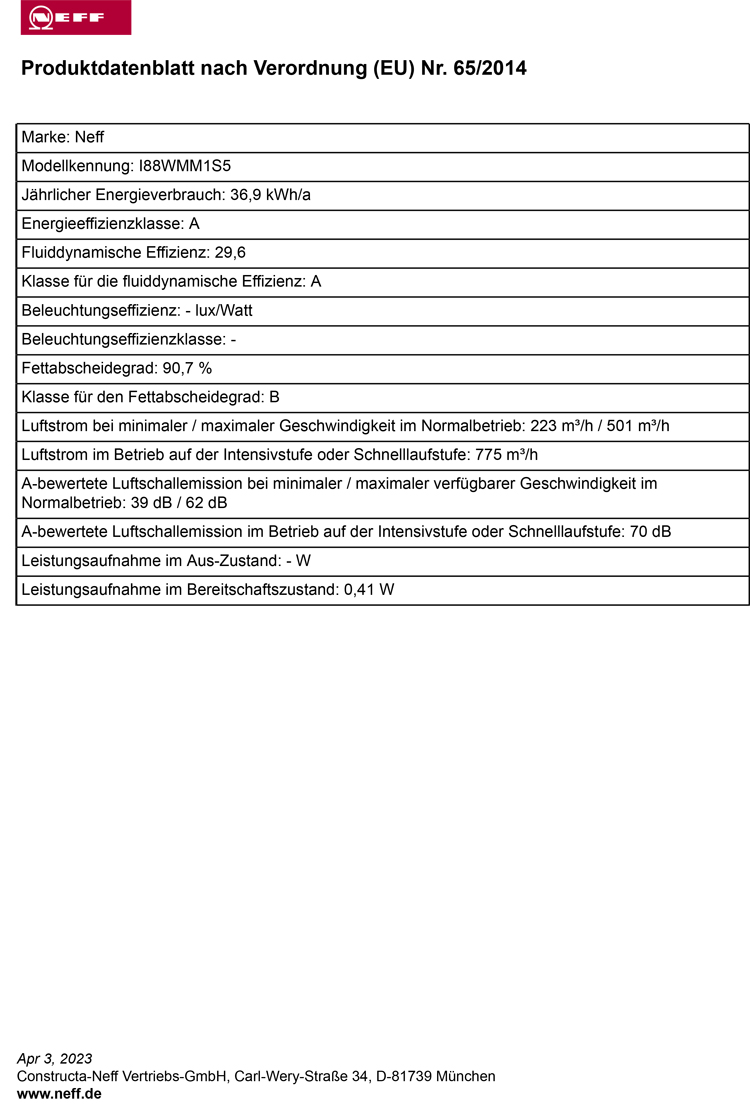 - Lüfterleistung bei Abluftbetrieb nach EN 61591: max. Normalstufe 501 m³/h, Intensivstufe 775 m³/h