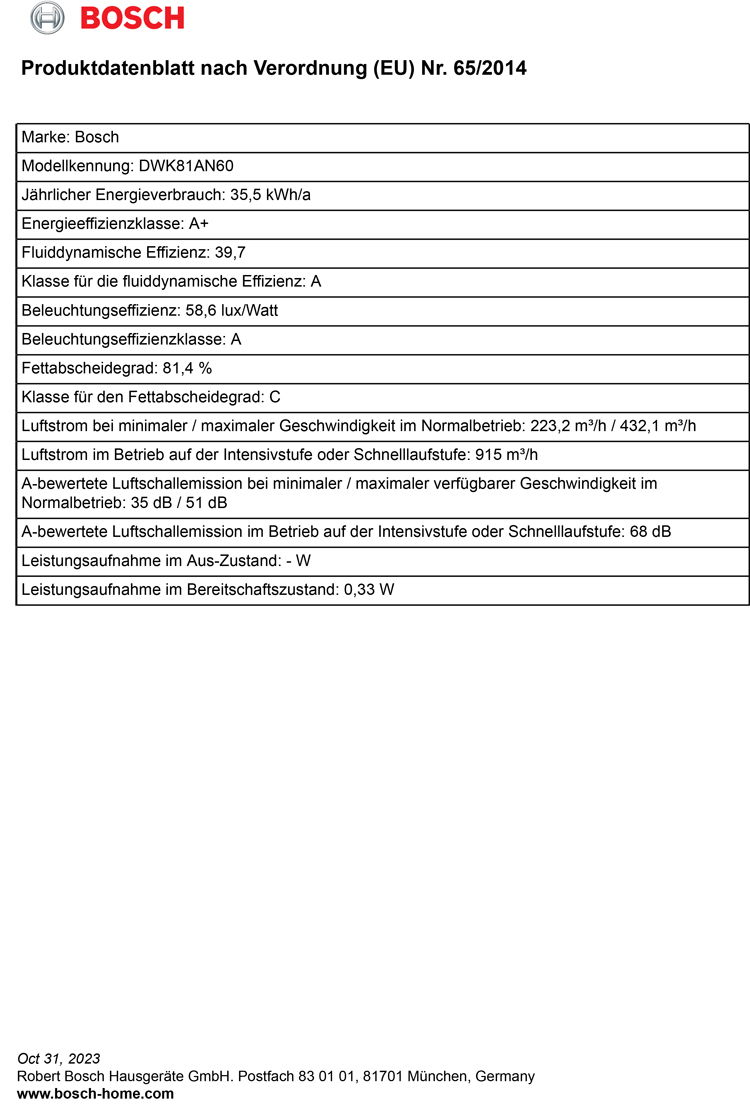 - Leistungsstufe 3: Lüfterleistung:438 m3/h; Geräuschwert: 60 dB(A) re1pW