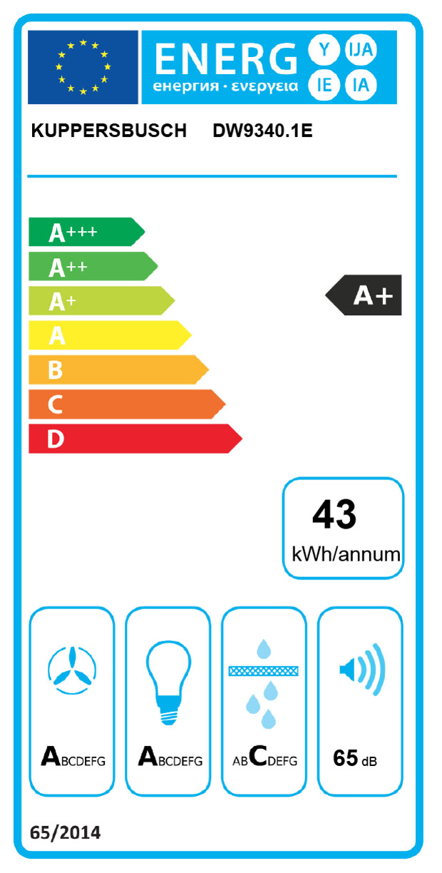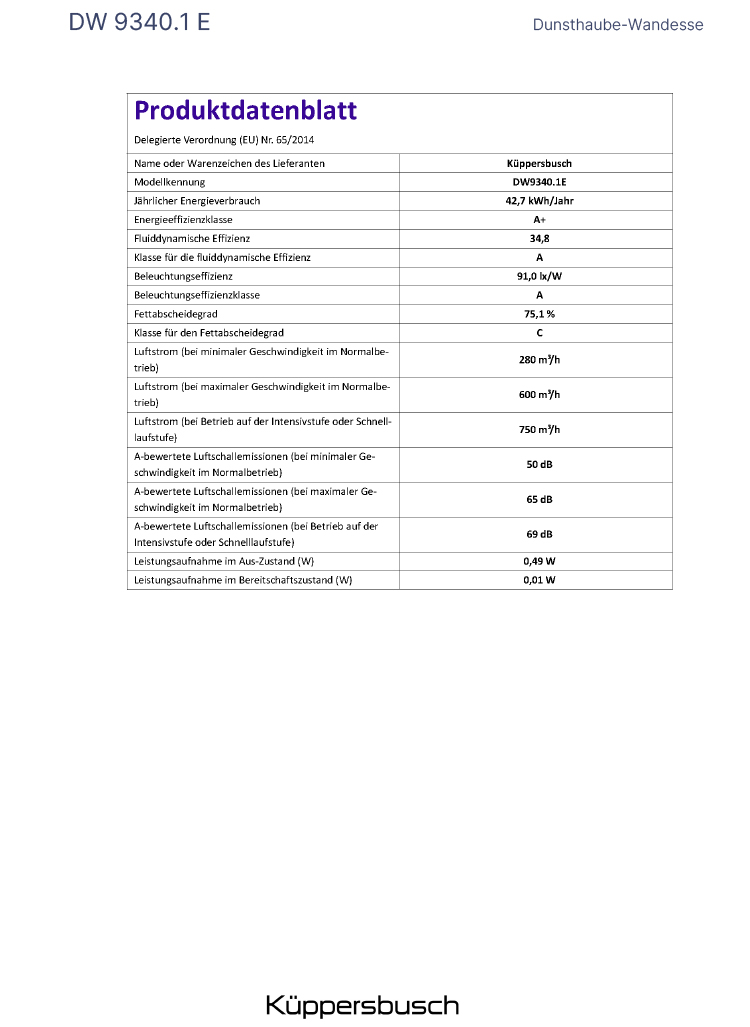 - Gebläseleistung im Abluftbetrieb nach Richtlinie 2010/30/EU: max. Normalstufe 600 m³/h, Intensivstufe 750 m³/h