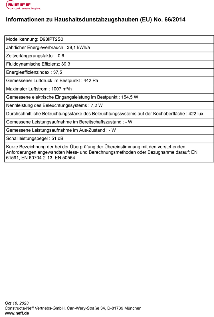 - Gemäß EN 61591 und EN/IEC 60704213 kann Ihr Gerät im Abluftbetrieb folgende Werte
