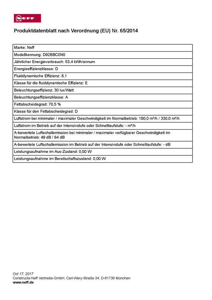 Geräuschwerte nach EN 60704-3 und EN 60704-2-13 max. Normalstufe Abluftbetrieb: 64 dB(A) re 1 pW (52 dB(A) re 20 µPa Schalldruck)