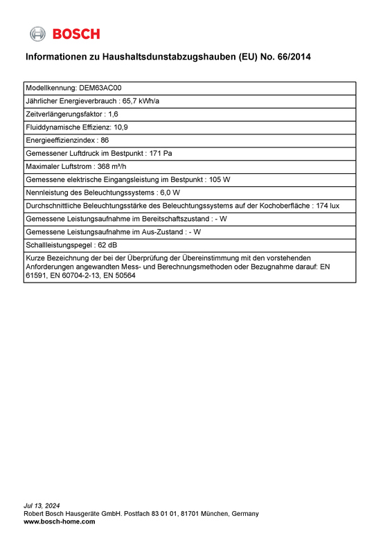Geräuschwerte nach EN 60704-2-13 max. Normalstufe Abluftbetrieb: Geräusch, höchste Normal-Stufe: 62 dB dB(A) re 1 pW