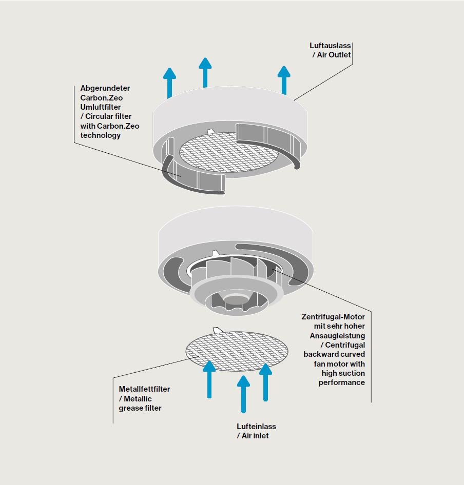 Konventionell werden Umluftfilter vor der Motoransaugung plaziert, wodurch es häufig zu mehr Betriebsgeräuschen und einer Verminderung der Ansaugleistung kommt. Circle.Tech hingegen nutzt die Zentrifugalkraft um den Kochwrasen (Gerüche und Feuchtigkeit) durch den Carbon. Zeo Filter zu drücken, was zu einer effektiven Geräuschreduzierung sowie einer höheren Ansauggeschwindigkeit führt. Auch die gleichmäßige Verteilung der abströmenden Luft sorgt für deutlich weniger Turbulenzen, wodurch die Betriebsgeräusche nochmals reduziert werden.