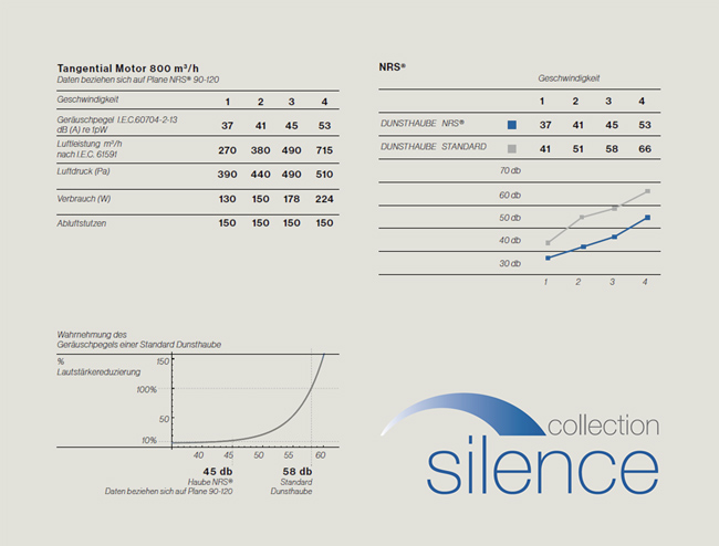 Das NRS®System (Noise Reduction System) wurde in Studien der Fluiddynamik (Teilgebiet der Strömungslehre) in Zusammenarbeit mit spezialisierten Laboren entwickelt. Auch durch den Einsatz neuester Dämmmaterialien konnten Ergebnisse erreicht werden, die bisher unvorstellbar waren. Für eine Küche mit mehr Wohlfühlcharakter. Dank der NRS® Technik können Sie kochen, sich unterhalten, arbeiten oder Musik hören ohne die typischen störenden Geräusche einer Dunstabzugshaube. Dabei profitieren Sie von einer bestmöglichen Absaugleistung.
