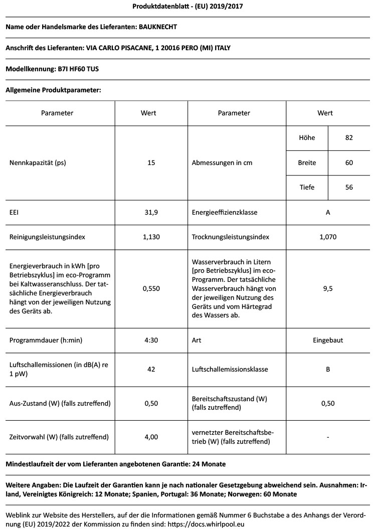 - Energieverbrauch des eco-Programms pro 100 Betriebszyklen: 55 kWh Strom, 9,5 Liter Wasser, 0,55 kWh Strom im eco-Programm pro Betriebszyklus