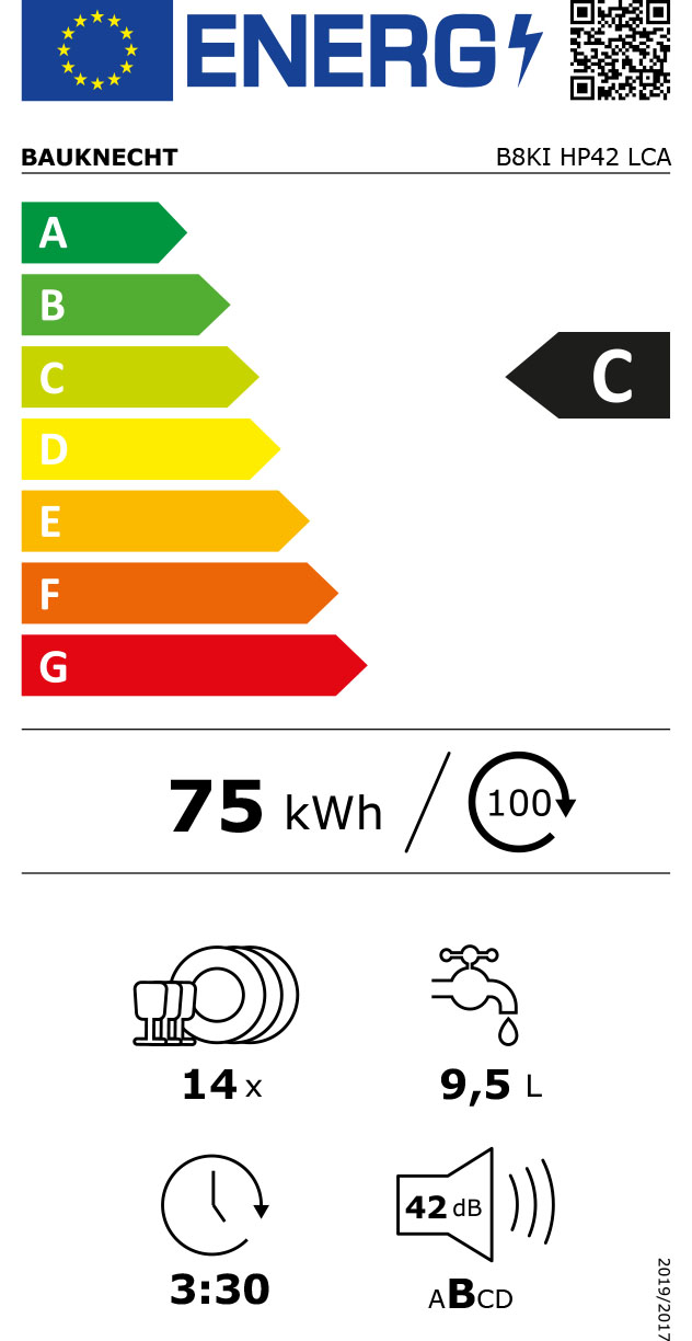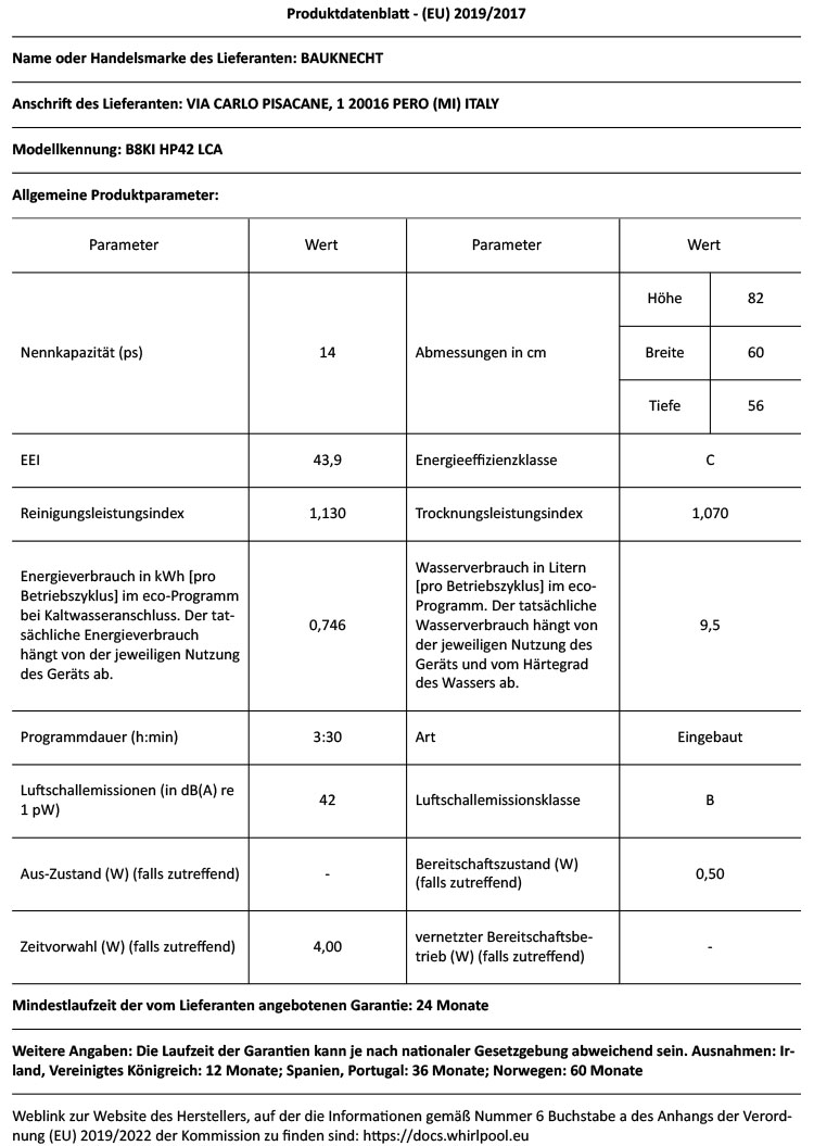 - Energieverbrauch des eco-Programms pro 100 Betriebszyklen: 75 kWh Strom, 9,5 Liter Wasser, 0,746 kWh Strom im eco-Programm pro Betriebszyklus