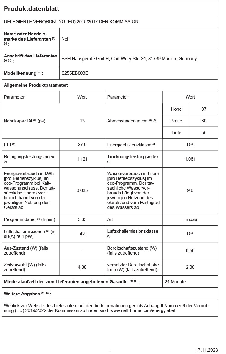 - Wasserverbrauch in Litern im eco-Programm pro Betriebszyklus (EU 2017/1369): 9.0 l