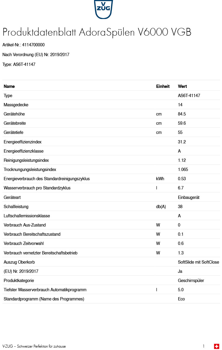 - Austausch gegen einen gleichwertigen oder neuen Artikel V-ZUG Adora V6000 VGB Geschirrspüler, vollintegrierbar, 4117700009 (ggf. auch ein Nachfolgemodell)