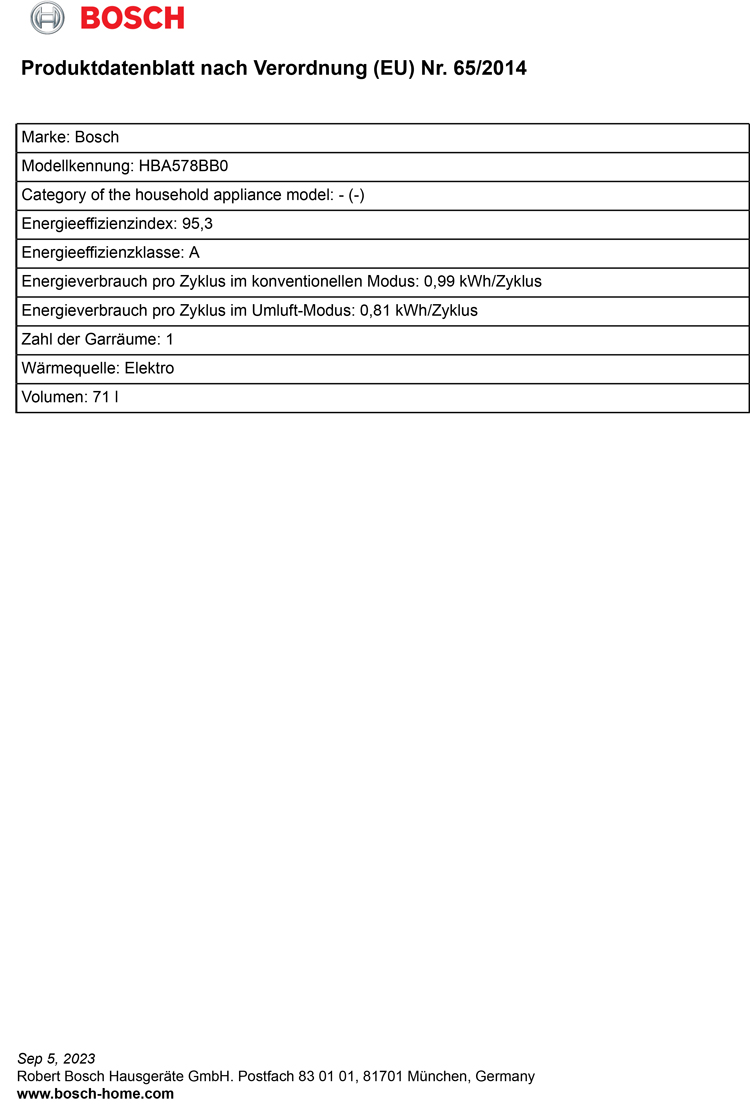 - Energieeffizienzklasse (gem. EU Nr. 65/2014): A (auf einer
