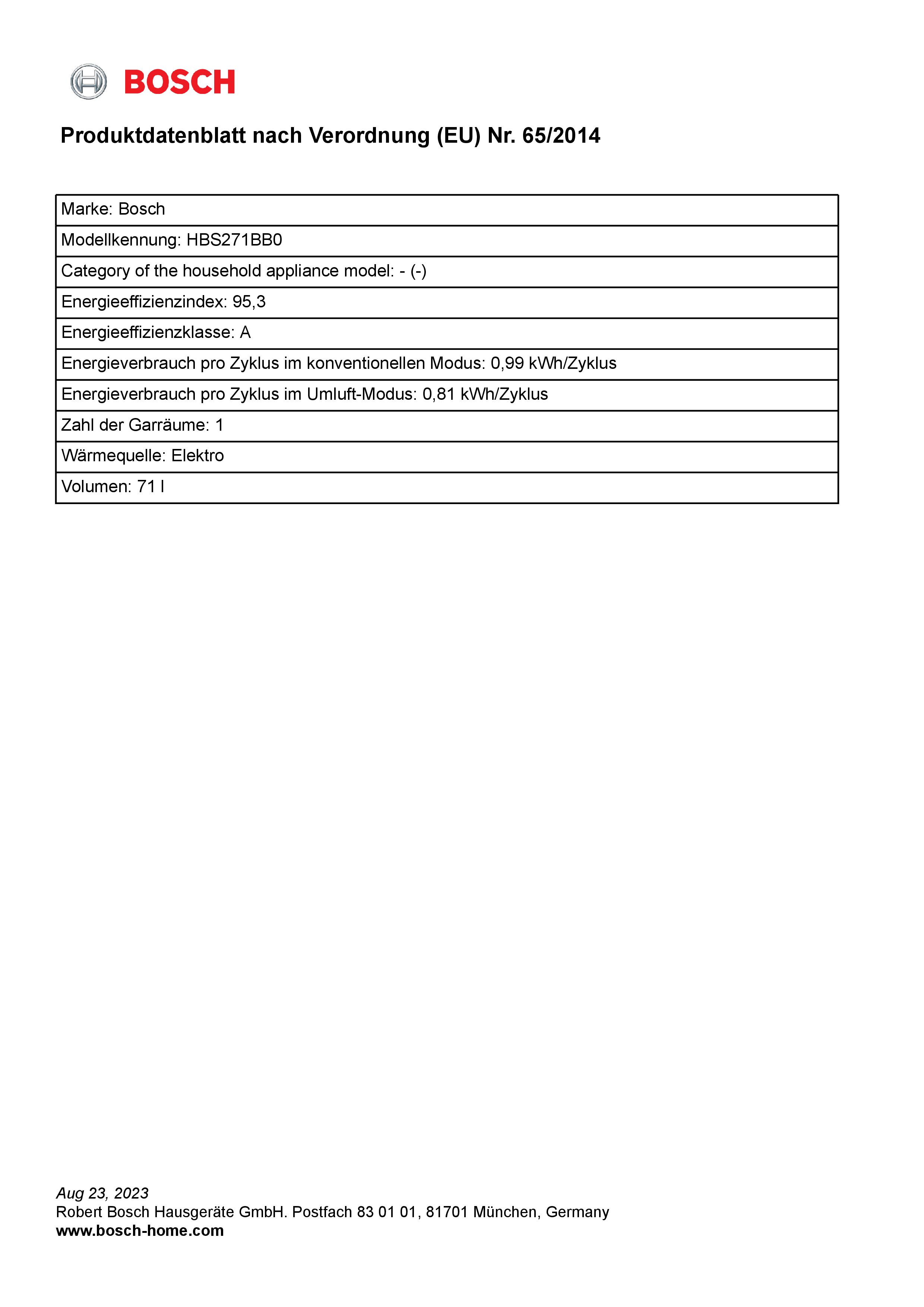 - Energieeffizienzklasse (gem. EU Nr. 65/2014): A (auf einer Energieeffizienzklassen-Skala von A+++ bis D)