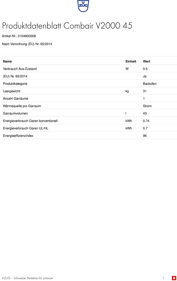 - Austausch gegen einen gleichwertigen oder neuen Artikel V-ZUG Combair V2000 45, Einbau-Backofen, Spiegelglas platinum (ggf. auch ein Nachfolgemodell)