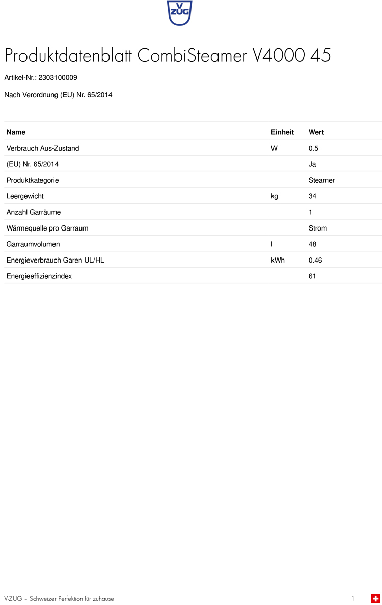 - Austausch gegen einen gleichwertigen oder neuen Artikel V-ZUG CombiSteamer V4000 45, Platinum, 2303100009 (ggf. auch ein Nachfolgemodell)