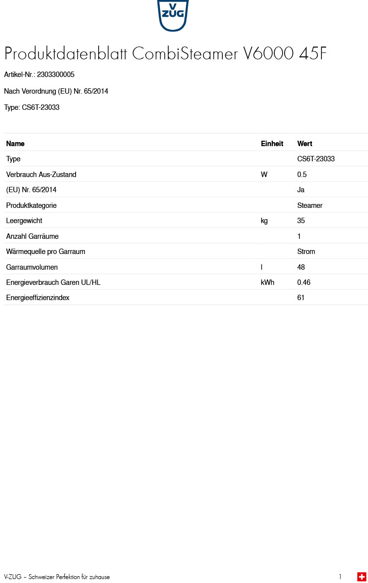 - Austausch gegen einen gleichwertigen oder neuen Artikel V-ZUG CombiSteamer V6000 45F, Spiegelglas Pearl, 2303300005 (ggf. auch ein Nachfolgemodell)