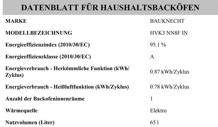 - Energieverbrauch nach DIN 0.78 kWh Umluft