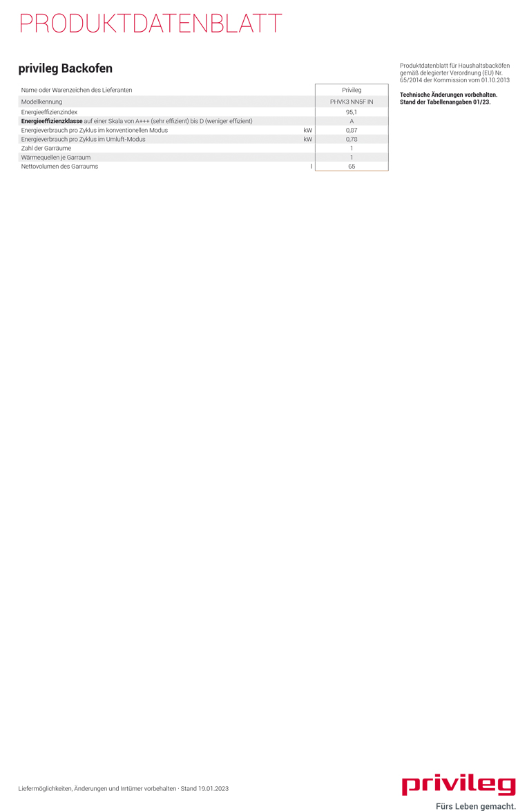 - Energieverbrauch nach DIN 0.78 kWh Umluft