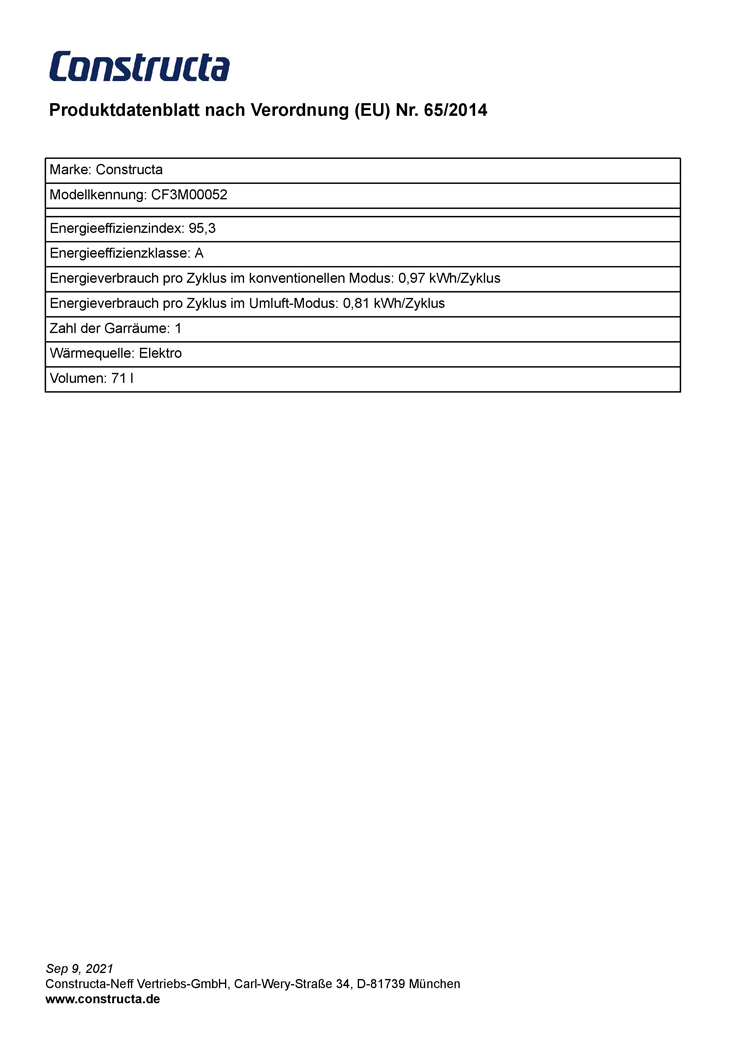 - Energieeffizienzklasse (gem. EU Nr. 65/2014): A (auf einer Energieeffizienzklassen-Skala von A+++ bis D)