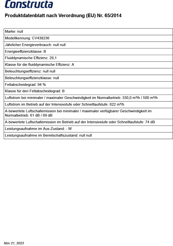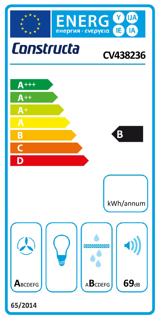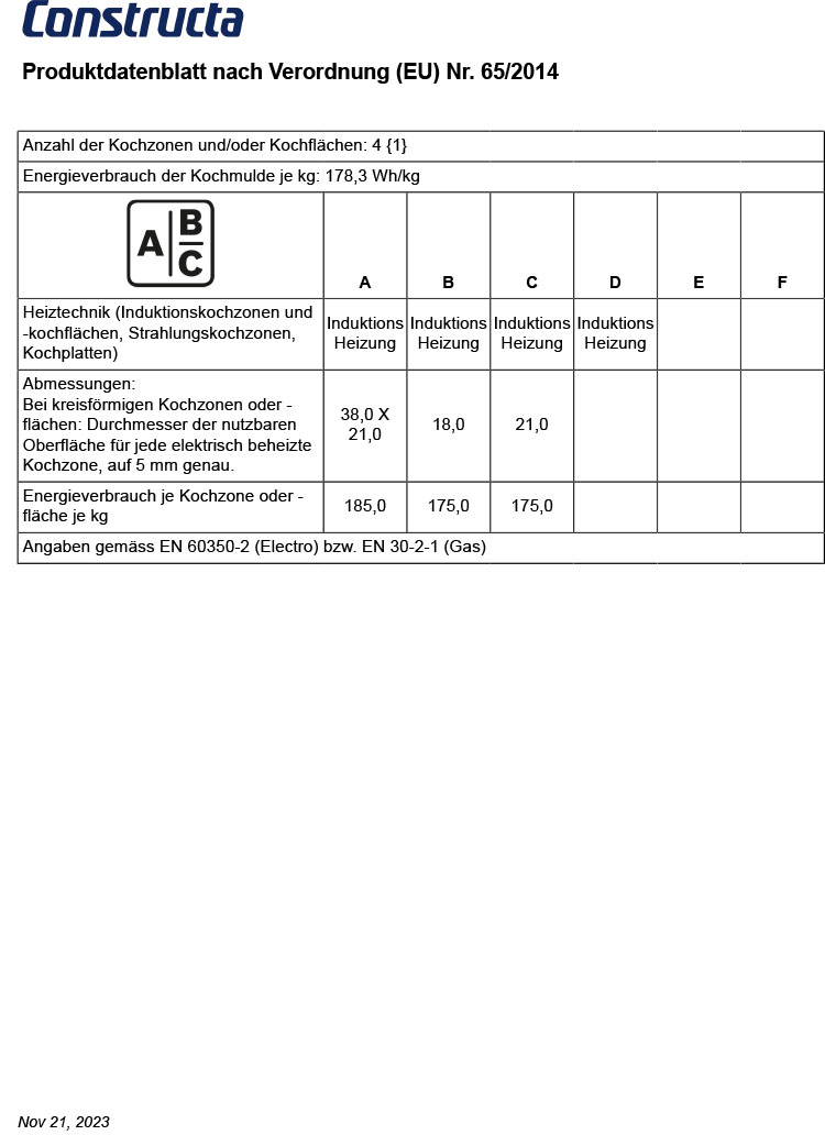 - Energieeffizienzklasse (gem. EU Nr. 65/2014): A (auf einer Energieeffizienzklassen-Skala von A+++ bis D)