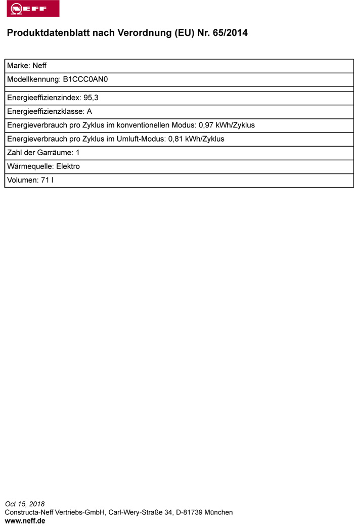 - Energieverbrauch pro Zyklus im Umluft-Modus: 0.81 kWh