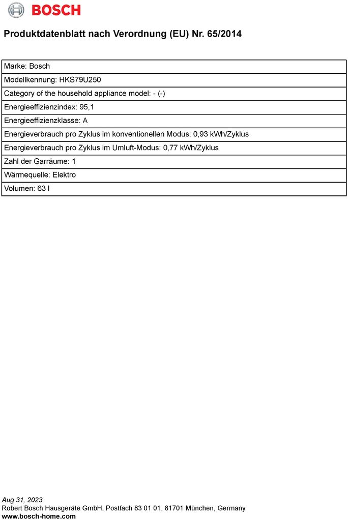 - Energieverbrauch pro Zyklus im Umluft-Modus:0.77 kWh