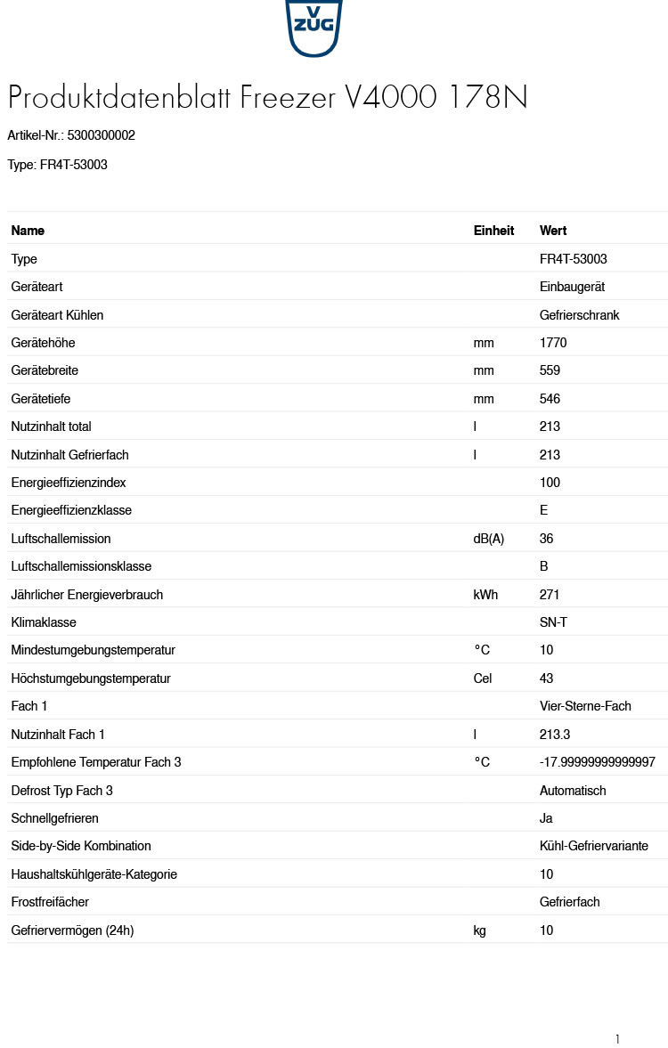 - Austausch gegen einen gleichwertigen oder neuen Artikel V-ZUG Freezer V4000 178N, 5300300002 (ggf. auch ein Nachfolgemodell)