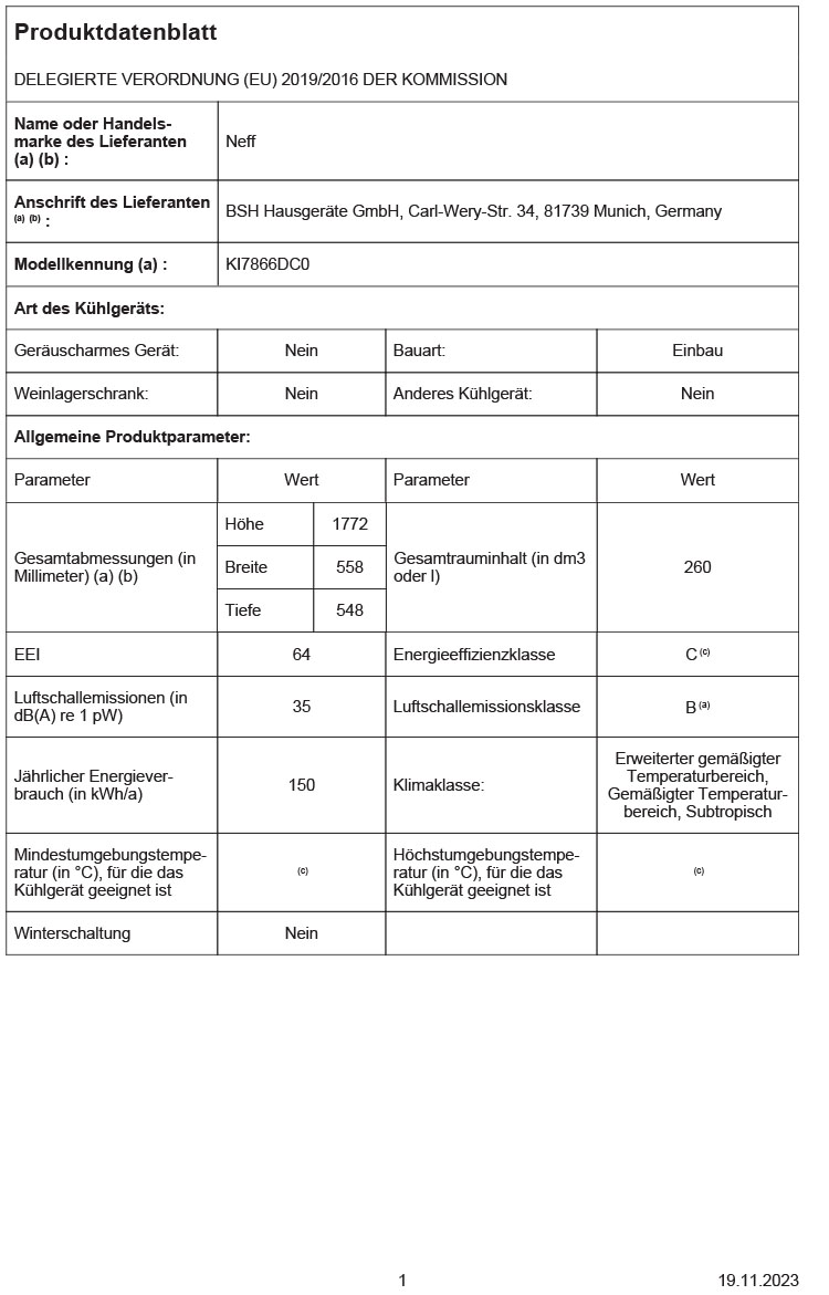 - Summe der Volumen der Kaltlagerfächer (EU 2017/1369): 184 l