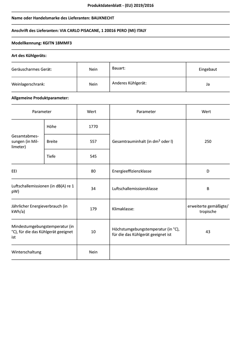 - Energieverbrauch: 179 kWh/Jahr