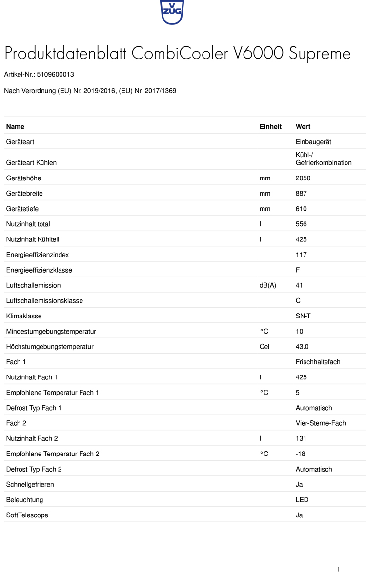 - Austausch gegen einen gleichwertigen oder neuen Artikel V-ZUG CombiCooler V6000 Supreme, 5109600013 (ggf. auch ein Nachfolgemodell)
