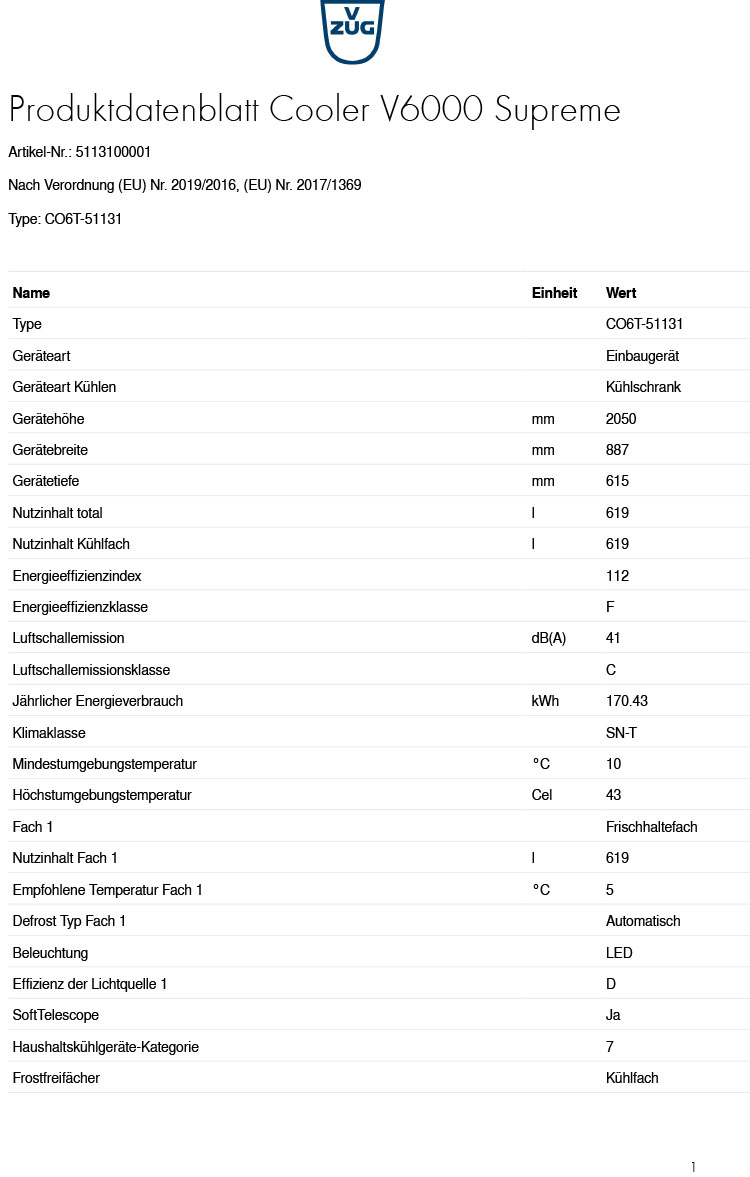 - Austausch gegen einen gleichwertigen oder neuen Artikel V-ZUG Cooler V6000 Supreme, Einbau-Kühlschrank, Linksanschlag, 5113100001 (ggf. auch ein Nachfolgemodell)