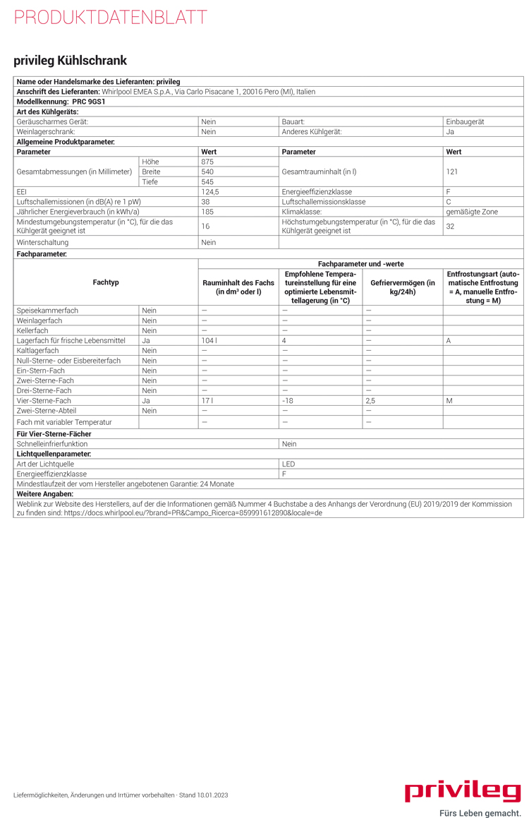 - Nutzinhalt: 104 l Kühlen, 17 l Gefrieren, gesamt 121 l