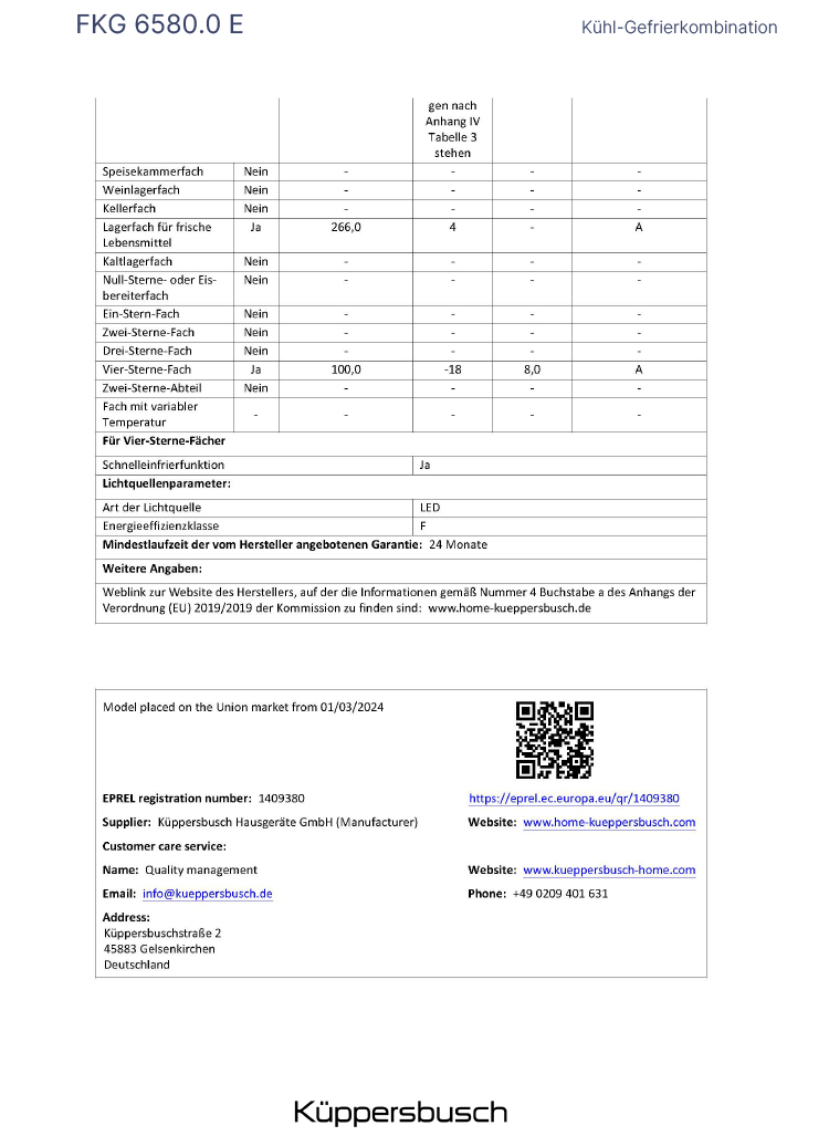 Der Hersteller gewährt deutschlandweit 5 Jahre Garantie auf den gelieferten Artikel Küppersbusch FKG 6580.0 E. Treten während dieses Zeitraums Material- oder Herstellungsfehler auf, gewährt der Hersteller im Rahmen der Garantie eine der folgenden Leistungen nach seiner Wahl: