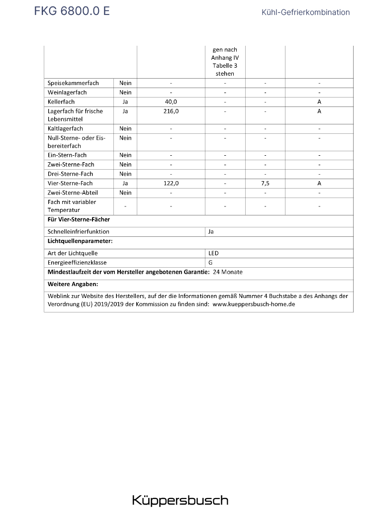 Der Hersteller gewährt deutschlandweit 5 Jahre Garantie auf den gelieferten Artikel Küppersbusch FKG 6800.0 E. Treten während dieses Zeitraums Material- oder Herstellungsfehler auf, gewährt der Hersteller im Rahmen der Garantie eine der folgenden Leistungen nach seiner Wahl: