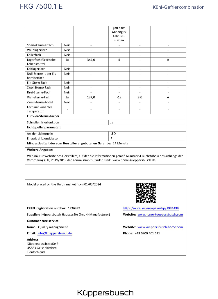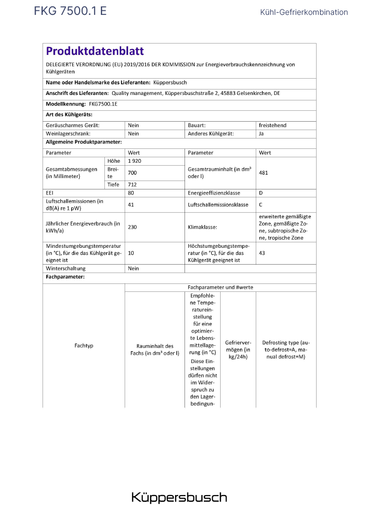 • Austausch gegen einen gleichwertigen oder neuen Artikel Küppersbusch FKG 7500.1 E (ggf. auch ein Nachfolgemodell).
