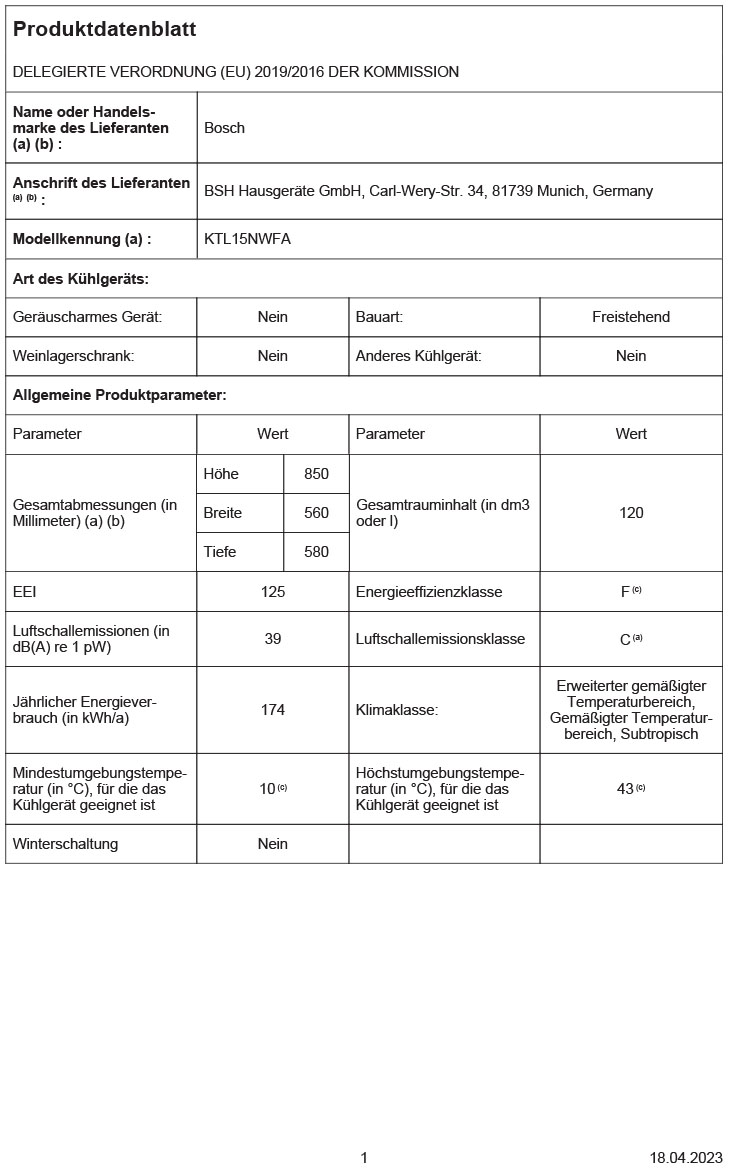 - Durchschnittlicher Energieverbrauch in Kilowattstunden pro Jahr (kWh/a): 174 kWh/annum