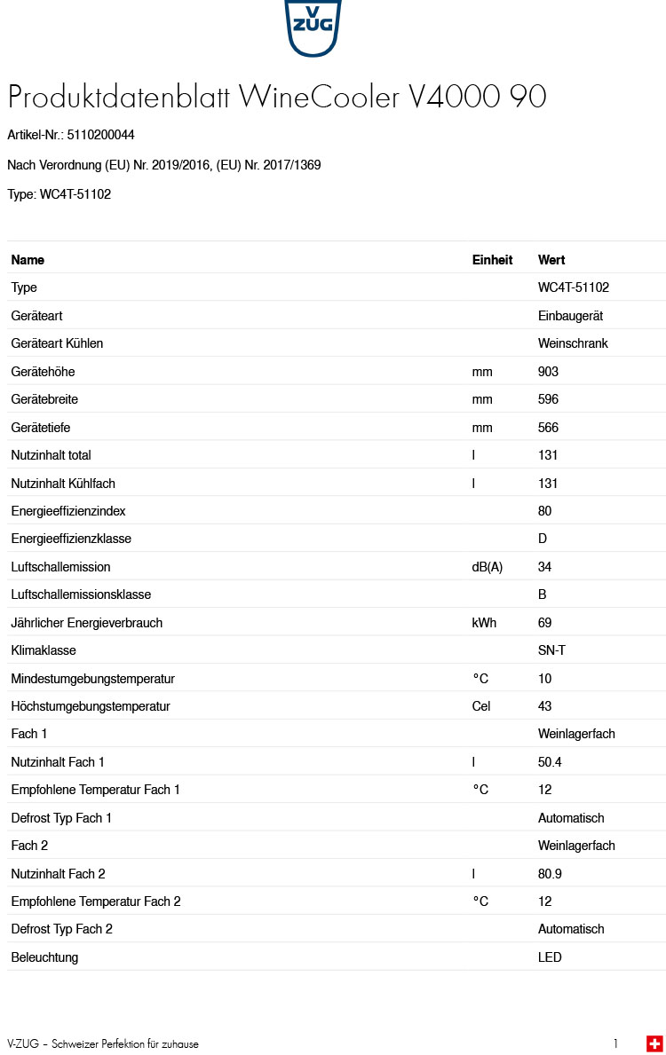 - Austausch gegen einen gleichwertigen oder neuen Artikel V-ZUG WineCooler V4000 90, Spiegelglas Pearl, Linksanschlag, 5110200044(ggf. auch ein Nachfolgemodell)