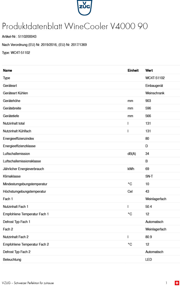- Austausch gegen einen gleichwertigen oder neuen Artikel V-ZUG WineCooler V4000 90, Spiegelglas Pearl, Rechtsanschlag, 5110200043 (ggf. auch ein Nachfolgemodell)