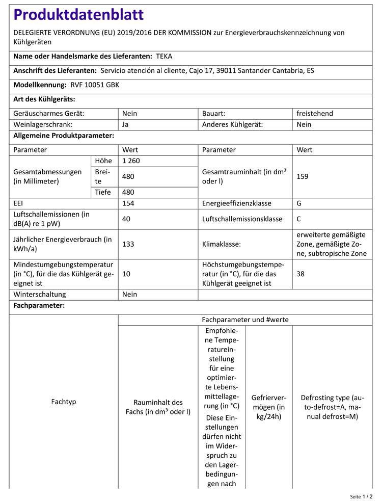 - Austausch gegen einen gleichwertigen oder neuen Artikel Teka RVF 10051 GBK, Stand Weinkühlschrank, 126 cm (ggf. auch ein Nachfolgemodell)