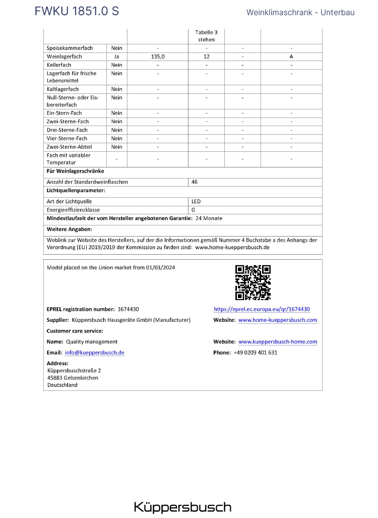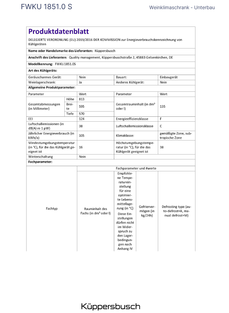 • Austausch gegen einen gleichwertigen oder neuen Artikel Küppersbusch FWKU 1851.0 (ggf. auch ein Nachfolgemodell).