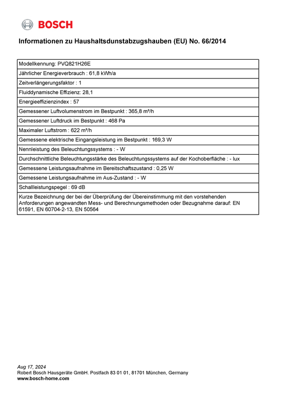 Geräuschwerte bei Umluftbetrieb: min. Normalstufe 41 dB re 1 pW, max. Normalstufe 68 dB re 1 pW, max. Boost-/Intensivstufe 72 dB re 1 pW