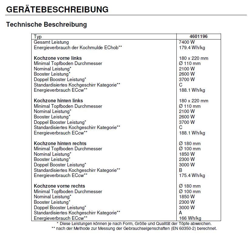 Energieverbrauch Kochmulde 179,4 Wh/kg