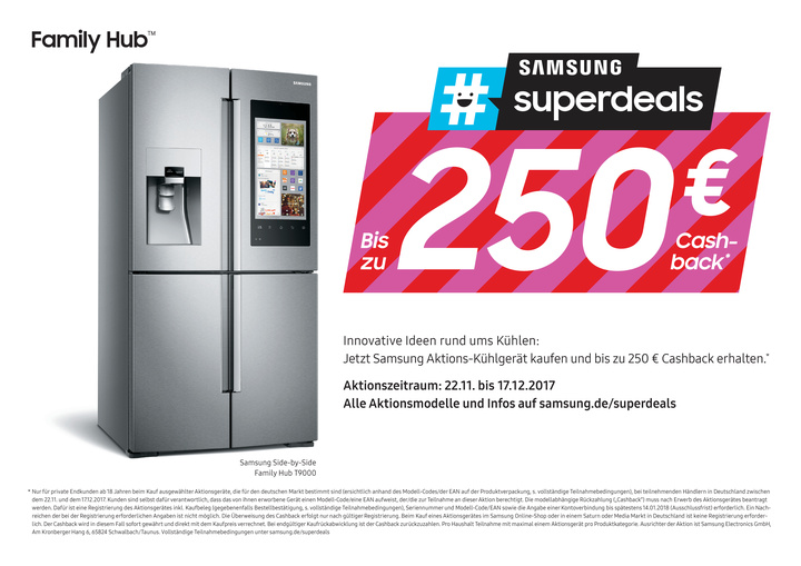 Profitieren Sie in der Zeit von 22.11. bis 17.12.2017 von einzigartigen Angeboten beim Kauf von Samsung Produkten und erhalten Sie bis zu 250,00 € Cashback für Ihre Treue. Die genauen Teilnahmebedingungen und Erläuterungen zur Einlösung der #superdeals erhalten Sie auf dieser Webseite: http://www.samsung.com/de/offer/superdeals/hausgeraete/