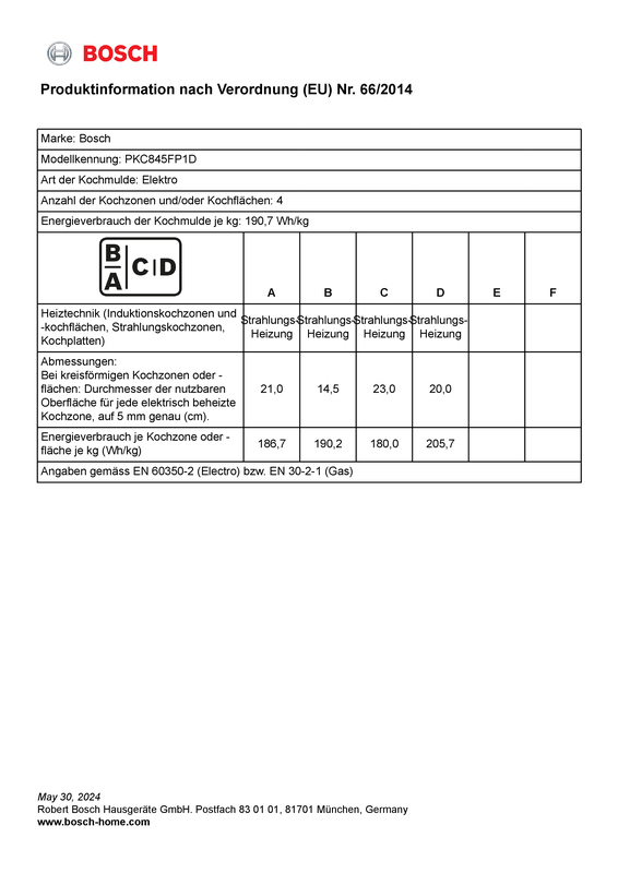 - Energieeffizienzklasse (gem. EU Nr. 65/2014): A (auf einer Energieeffizienzklassen-Skala von A+++ bis D)