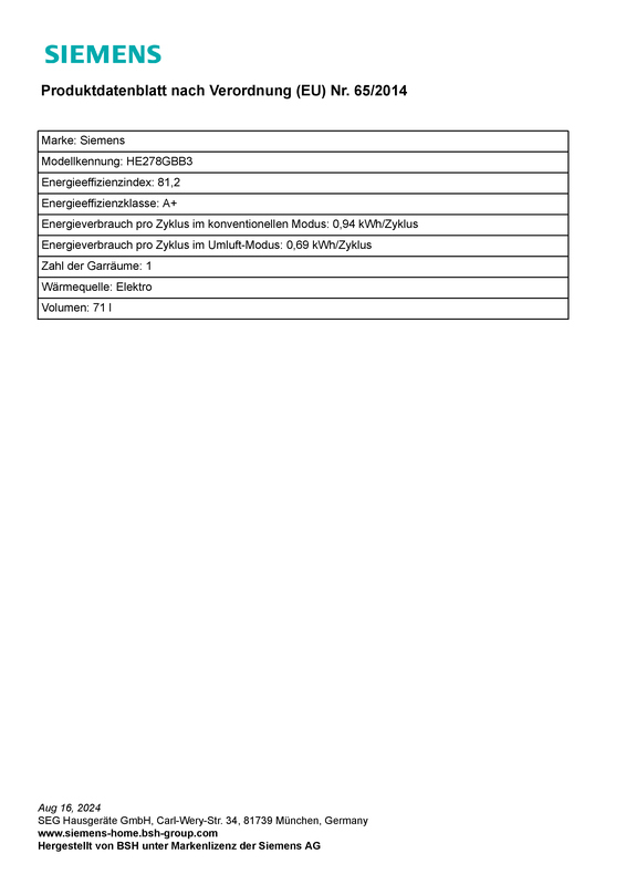 Beschreibung Siemens HE278GBB3, Einbaubackofen 60 x 60 cm, iQ500, Deep black inox, EEK: A+: