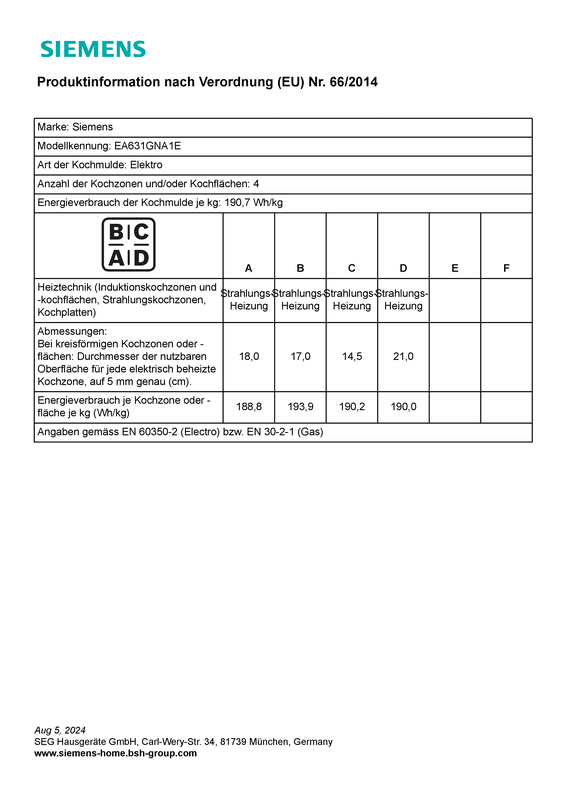 Beschreibung Siemens iQ300 EA631GNA1E Elektrokochfeld, 60 cm, herdgesteuert, Schwarz, Rahmenlos aufliegend: