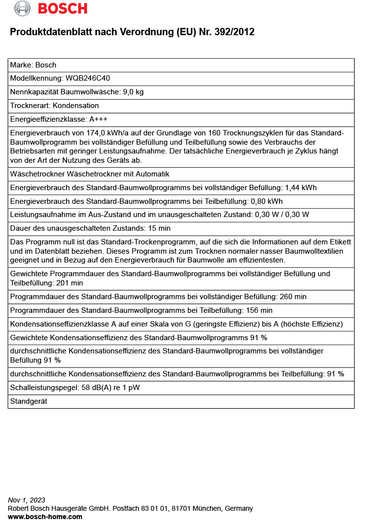 - Durchschnittliche Kondensationseffizienz des Standard-Baumwollprogramms bei vollständiger Befüllung (%): 91 %