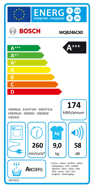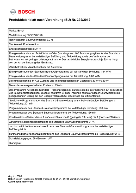 - Durchschnittliche Kondensationseffizienz des Standard-Baumwollprogramms bei vollständiger Befüllung (%): 91 %