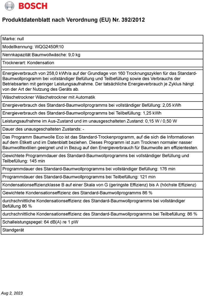 - Energieverbrauch des Standard-Baumwollprogramms bei vollständiger Befüllung: 2.05 kWh