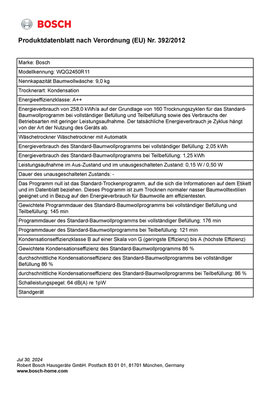 - Gewichtete Kondensationseffizienz für das Standard-Baumwollprogramm bei vollständiger Befüllung und Teilbefüllung (%): 86 %
